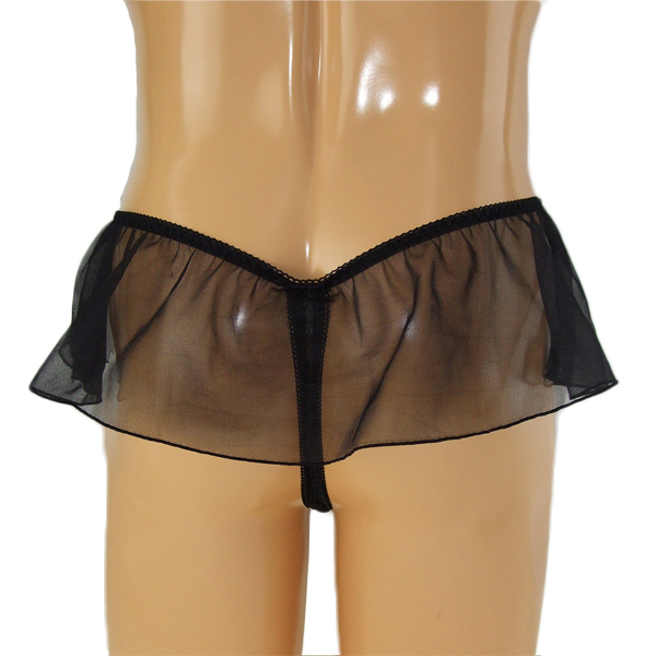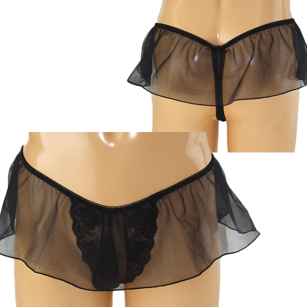 揺れるレースがエレガント!可愛いが好きな男性のための日本製レーススカート付Tバック(黒)。動くたびユラユラ揺れる極薄生地が美しくもエロティックなデザイン!レース生地から透けて見えるレース刺繍のTバックもまたセクシーな一枚です。女装下着用にぜひどうぞ!