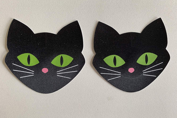 猫の目が暗闇で妖しく光る!蓄光仕様の黒猫ニップレス(2枚1セット)。ハロウィンやホラーイベントに最適♪乳首に触れる裏面中央部分は肌保護のため粘着しない素材を使用しています。