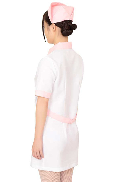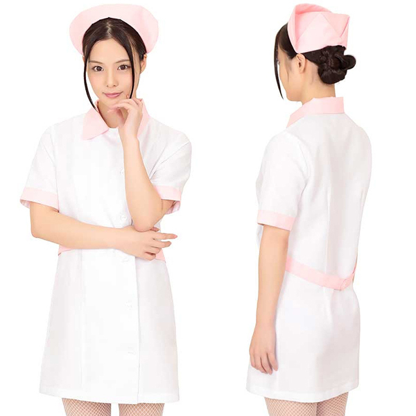 白をベースとしたシンプルなナース服に、優しい淡いピンクカラーをポイントにしたミニ丈ナース服。ワンピース、ナースキャップとピン2本のセット!ハロウィンや忘年会、宅コスに是非どうぞ♪