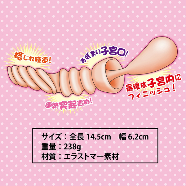 硬く閉じた入口を押し広げると、渦巻くスパイラル膣道が貴男を奥へ誘い、うねる肉壁が連続で刺激、キュンと締まる子宮口がチュパチュパと亀頭へ吸い付きます♪未だ成熟していない最奥の強力バキュームで絶頂へ!ローション付属