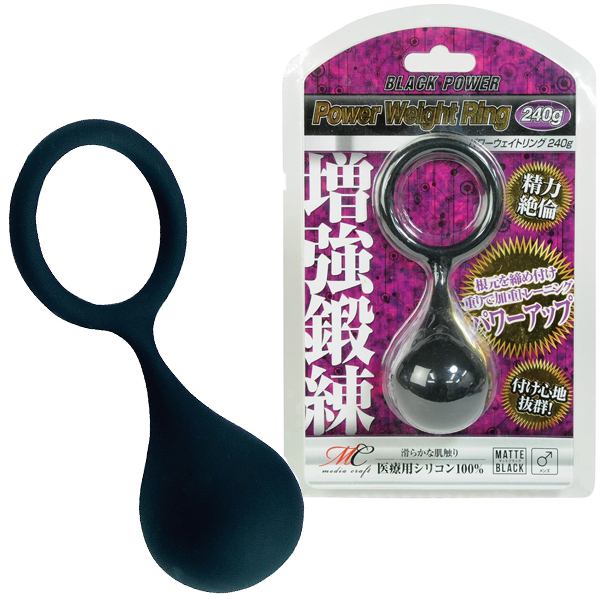 己を磨いて精力絶倫を目指せ!ペニス増強グッズ「パワーウェイトリング (240g)」は、医療用シリコン100%の重り式ペニス鍛錬サポートアイテムとなっております♪着け方は簡単!リングをペニスに通して根元にかけるだけ。