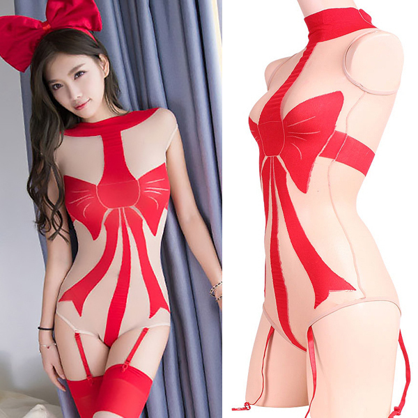 誕生日やクリスマス、バレンタインなどのイベントに♪真っ赤なリボン柄で全身を装飾するガーターベルト付きのボディストッキング&ガーターストッキングのセット商品。