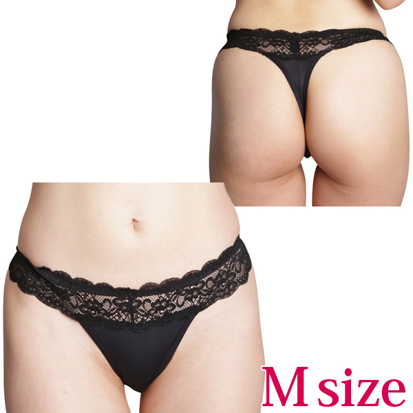 ウエスト周りに繊細なエレガントレースを施した黒の上品なTバック。縁にスカラップレースを飾り女性らしさを高めた1枚♪大、小サイズの異なるポケット付※ローターは付属しておりません。