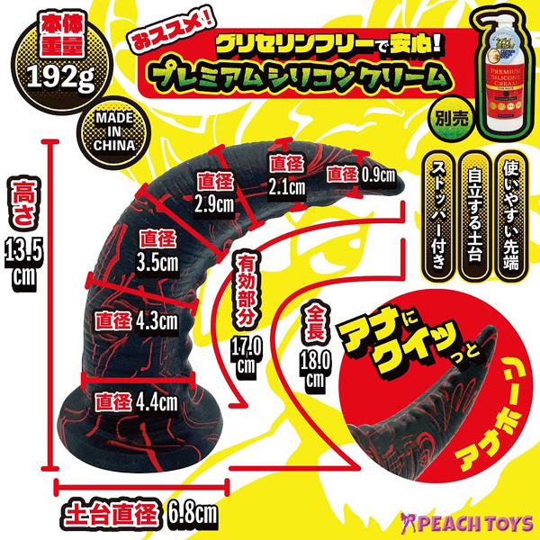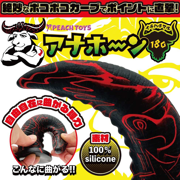 「穴にクイッと!このカタチ」「アナホーン180(イチハチマル)」角のようなカーブ形状のディルドの登場です!使いやすい先端と、絶妙なボコボコカーブでポイントに直撃!100%シリコン素材でべたつかず、自由自在に曲がる弾力!自立する土台!(