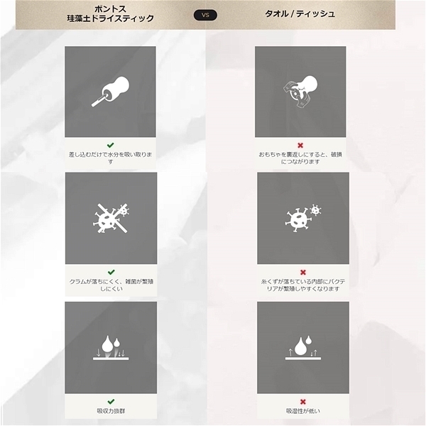 ポントス珪藻土ドライスティックは、おもちゃの水分を奥まで吸収し、おもちゃを何度もひっくり返すことによる損傷を防ぎます。