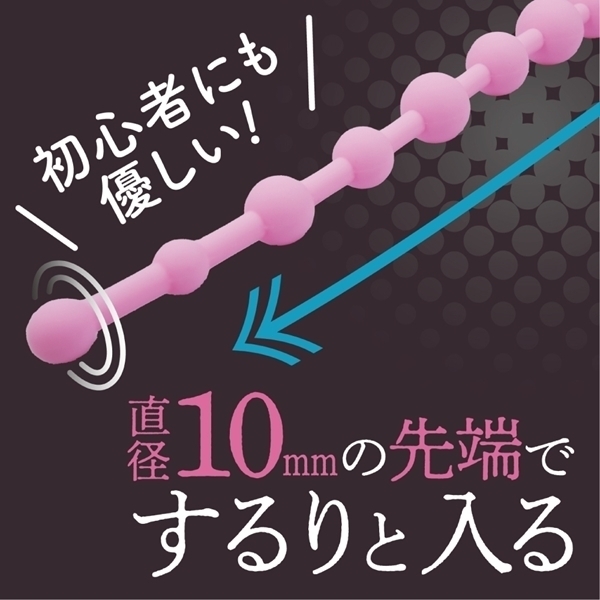 先端部10mmから25mmの9個のシリコンビーズが連続に襲ってくる初心者用。まずはここからメス化TRY!取っ手部のサイズは55mm全長340mmと全てシリコン素材の為、柔らかく丸洗いも出来て清潔に保っていただけます。
