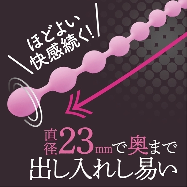 直径23mmの9個のシリコンビーズが連続に襲ってくる中級者向け。まずはここからメス化TRY!取っ手部のサイズは55mm全長335mmと全てシリコン素材の為、柔らかく丸洗いも出来て清潔に保っていただけます。