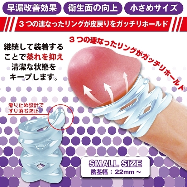 3つの連なったリングが皮戻りをがっちりホールド!継続して装着することで蒸れを抑え、清潔な状態をキープします。