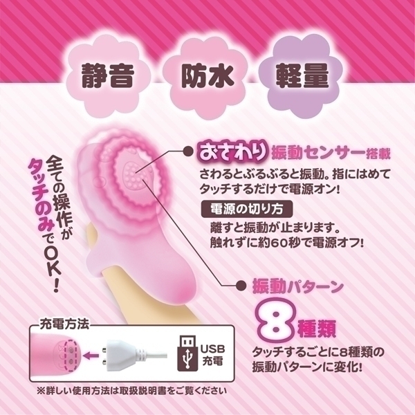 触れるだけで動き出す新感覚のタッチセンサー搭載アイテムです!全ての操作がタッチのみで完結するので、簡単で直感的な操作が可能♪指にはめて触れると振動がスタートし、触れるたびに振動パターンが変化します!離すと自動で停止し、触れずに約60秒経過すると電源がオフになる省エネ設計♪本体は33.5gの超軽量設計で、持ちやすく疲れにくい仕様!高品質なシリコンボディを採用し、防水性能と静音性も兼ね備えています♪使いやすさと機能性を両立したハイスペックな一品!日常のリラックスタイムや特別なひとときにぴったりのアイテムです♪