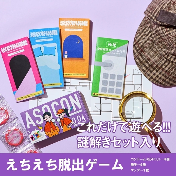 新たな刺激を楽しめる謎解き体験が登場♪あそぶ前戯ゲーム付きコンドーム「ASOCON」えちえち脱出ゲームは、2人で協力して楽しめる謎解きゲーム付きセットです!舞台はちょっと特別なシチュエーション♪付属の冊子には、全5種類のミッションが収録されています!謎を解きながら物語を進めていくことで、自然とコミュニケーションが深まります♪頭を使いながらワクワク感を共有できるのがこのアイテムの魅力です!「ASOCON」シリーズ史上最大ボリュームの内容で、何度も楽しめる工夫が満載♪コンドームは0.04mmの薄さで、使いやすさにも配慮!素材は天然ゴムラテックス製、ゼリー加工でスムーズな使用感を実現しています♪いつもと違う体験を求めているカップルにぴったりのアイテムです!