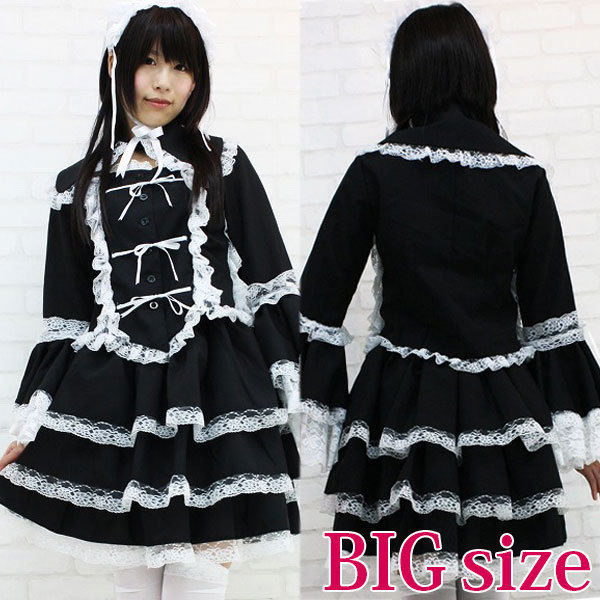 仕様:BIGサイズ:B85〜90cm・W90〜116cm 丈:上着53cm(袖65cm・肩幅39cm)・スカート48cm セット内容:ジャケット(前ボタン留め、姫袖)・別衿・ヘッドドレス(総レース仕様、バラのコサージュ付き)・スカート(ウェストゴム入り)