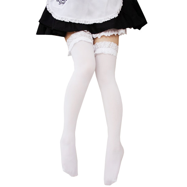 メイド服やゴスロリ衣装と相性バッチリ!上品なレース付き白ニーハイソックス。