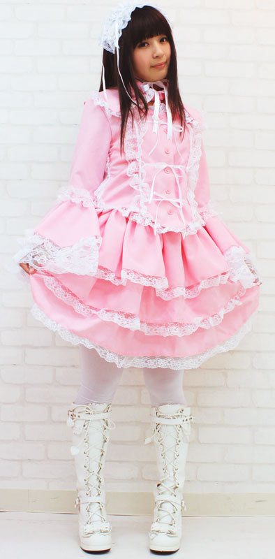 仕様:Mサイズ:B〜94cm・W62〜106cm 丈:上着48cm(袖丈62cm・肩幅38cm)・スカート48cm 付け襟(首回り)40cm セット内容:上着(前ボタン)・スカート(ウエスト部分ゴム、スカート3枚仕立て、裏地付き、チュールパニエ付き)・付け衿(ボタンにて着脱可)・ヘッドドレス