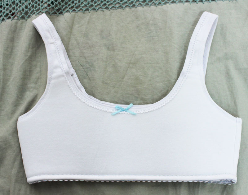 爽やかさ100%!フロントにちょこんと付いた水色リボンがキュートな純白のスポブラ単品(M)。