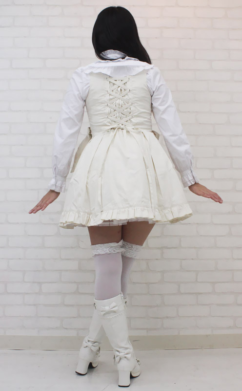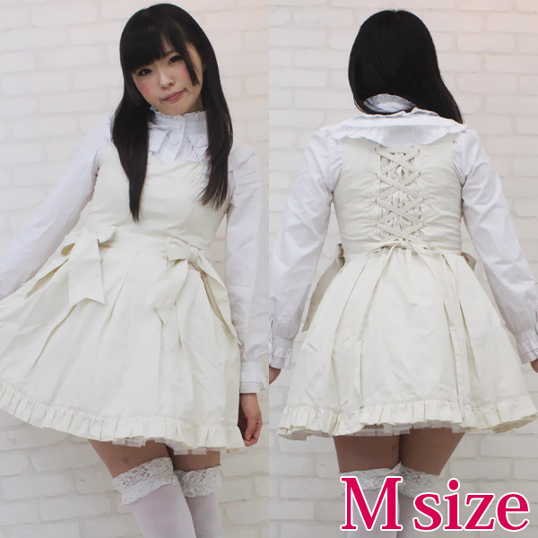 仕様:Mサイズ:B78〜86cm・W62〜74cm 丈:ジャンパースカート76cm・ブラウス49cm(肩幅36cm、袖丈61cm、袖口20cm) セット内容:ジャンパースカート(横ファスナー、後ろ編み上げシャーリング、パニエ内蔵)・ブラウス(前ボタン、後ろ編み上げシャーリング)