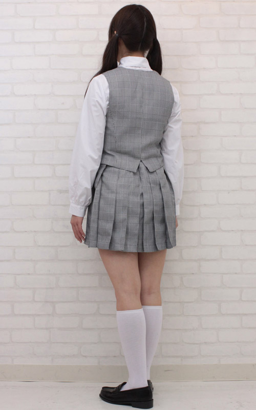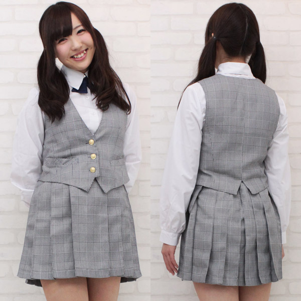 金ボタン付きのベストがポイントになった中間服タイプ!グレーチェックで清楚なお嬢様風に仕上げた制服コスプレ(BIG)。