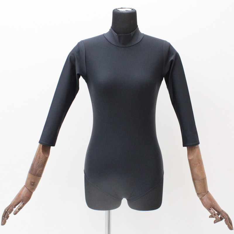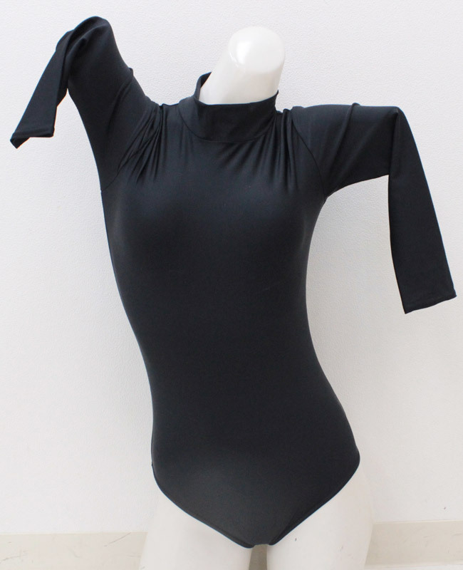 柔らかで伸縮性のある生地を使用した、ブラックカラーのシンプルな七部袖丈ハイネックレオタード(単品)。