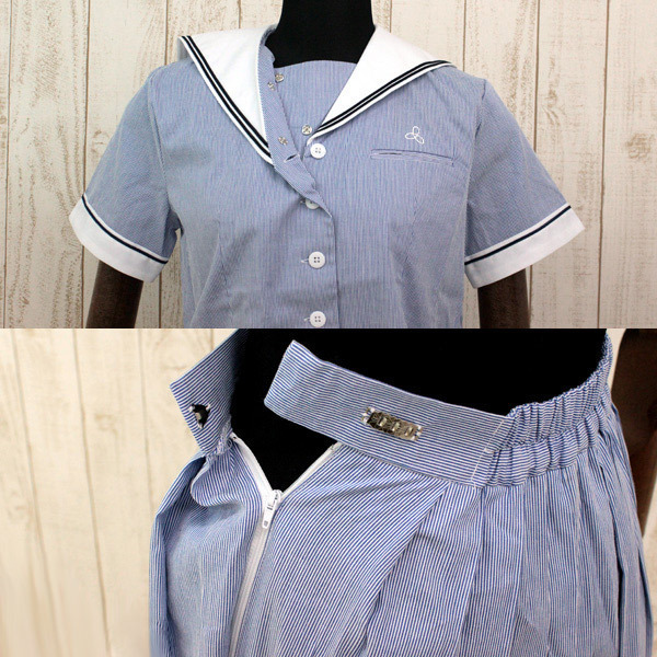 ●Mサイズ:B〜95cm・W〜72cmに対応●淡いブルーカラー●トップス:スナップボタン&前開きボタン留め(胸ポケットあり)●セーラー襟&半袖にライン入り(夏制服タイプ)●プリーツスカート:サイドファスナー&3段ホック留め。
