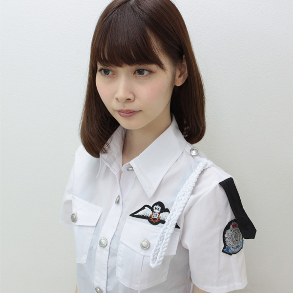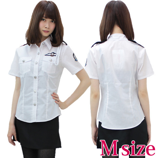 ●ホワイトカラーの半袖ブラウス(前開きボタン)●実用的なポケット付き●左肩にロープ付き(取り外し不可)●シンプルだけどオシャレ感のある銀色ボタン●スリット入りのタイトなミニスカート(後ろコンシールファスナー)●女性用Mサイズ。