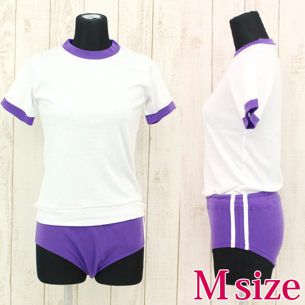 深めの紫ブルマに2本の白ラインを施した白トップスとの上下セット。