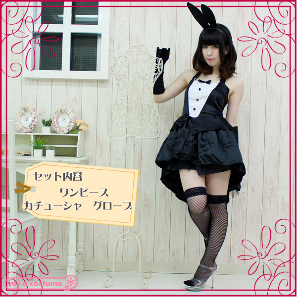 白くて丸い尻尾付きのワンピースに、ウサ耳付きカチューシャ、黒のグローブのセット!適度な肌魅せで女らしさを高めつつ可愛さにもこだわった白黒カラーのバニー衣装です。