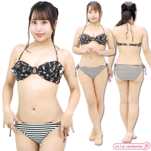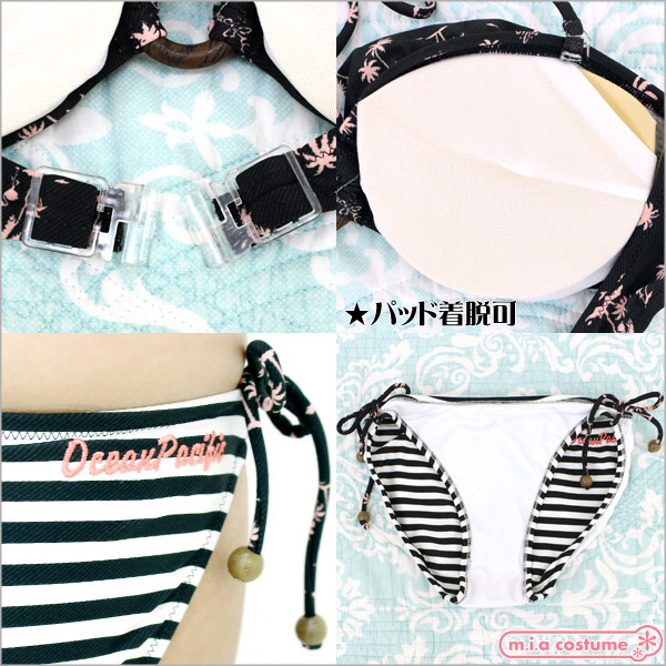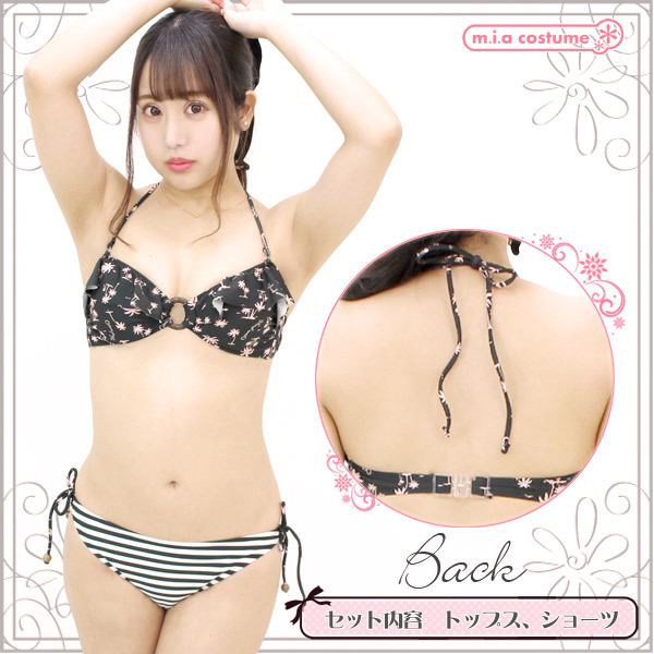 仕様:9Mサイズ:B83cm・H87〜95cm セット内容:トップス(パッド着脱可、ワイヤー無し)、ビキニショーツ 素材:ポリエステル85%、ポリウレタン15% 生産国:日本