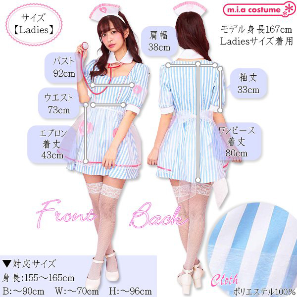 仕様:対応サイズ:身長155〜165cm・B〜90cm・W〜70cm・H〜96cm 実寸:B92cm・W73cm・肩幅38cm・袖丈33cm・着丈80cm、エプロン丈43cm セット内容:カチューシャ、付け襟、ワンピース(背中心ファスナー)、エプロン、腕章、聴診器 素材:ポリエステル100%