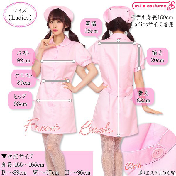 仕様:対応サイズ:身長155〜165cm・B〜89cm・W〜67cm・H〜96cm 実寸:B92cm・W80cm・H98cm・肩幅38cm・袖丈20cm・着丈82cm セット内容:ナースキャップ、ワンピース(前ボタン) 素材:ポリエステル100% モデル身長160cm