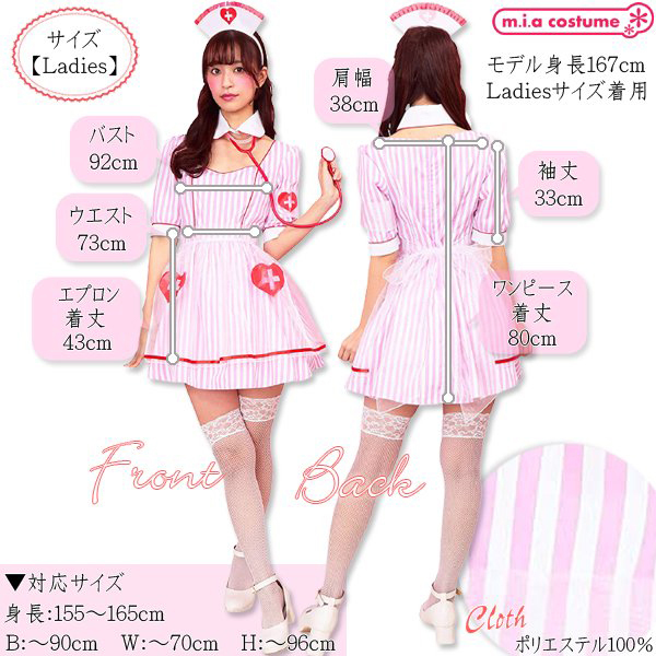 仕様:Mサイズ 対応サイズ:身長155〜165cm・B〜90cm・W〜70cm・H〜96cm 実寸:B92cm・W73cm・肩幅38cm・袖丈33cm・着丈80cm、エプロン丈43cm セット内容:カチューシャ、付け襟、ワンピース(背中心ファスナー)、エプロン、腕章、聴診器 素材:ポリエステル100%