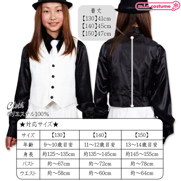 仕様:130サイズ 対応サイズ:身長125〜135cm・B〜67cm・W〜58cm 実寸:着丈41cm セット内容:ベスト単品(前ボタン) 素材:ポリエステル100%