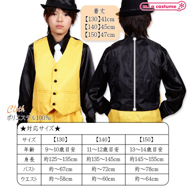 仕様:130サイズ 対応サイズ:身長125〜135cm・B〜67cm・W〜58cm 実寸:着丈41cm セット内容:ベスト単品(前ボタン) 素材:ポリエステル100%