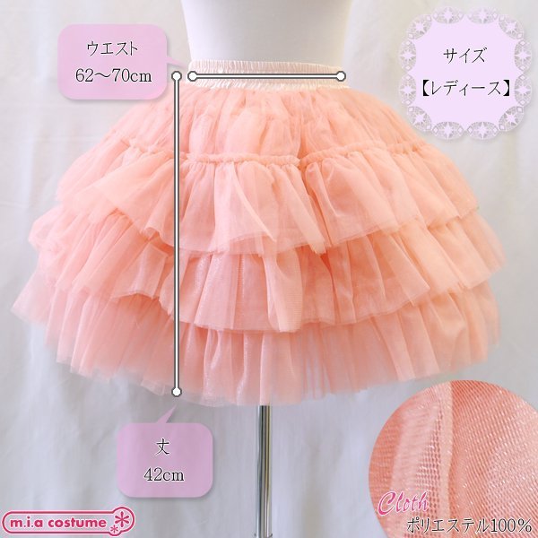 仕様:フリーサイズ:W62〜70cm・着丈42cm セット内容:パニエ単品(3段フリル) 素材:ポリエステル100%