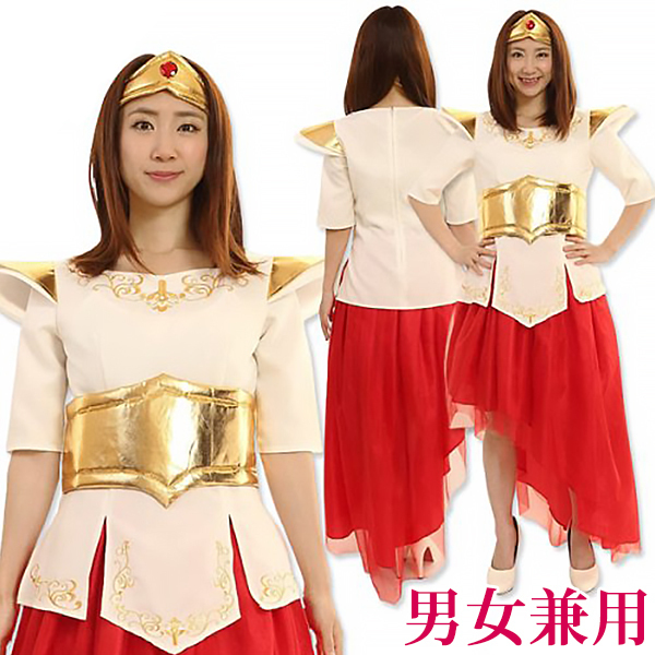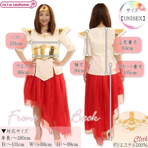 仕様:男女兼用サイズ:身長〜180cm・B〜101cm・W〜88cm・H〜99cm・着丈(上衣63cm・スカート105cm)・袖丈30cm) セット内容:上衣(背中心ファスナー)、スカート(ウエストゴム)、ヘアバンド 素材:ポリエステル100%