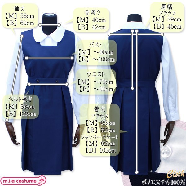 仕様:BIGサイズ:B〜100cm・W〜90cm・ブラウス着丈80cm・ジャンパースカート丈102cm・袖丈60cm・肩幅45cm・首周り42cm・ベルト106cm セット内容:ブラウス(前ボタン)、ジャンバースカート(裏地有り・脇と肩スナップボタン留め)、ベルト 素材:ポリエステル100%