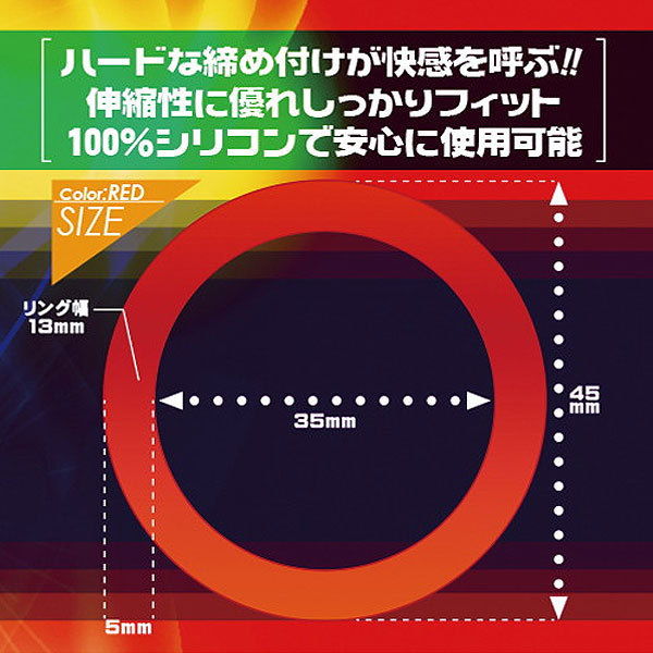 内径35mmで竿と袋の根元をググッと締め付け可能!勃起力をUPさせながら持続力を高め、男らしい夜を演出してくれます。