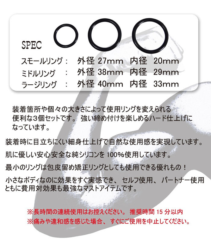 ●ペニスリング3個セット(ソフトタイプ)●純シリコン100%使用●スモール:外径27mm・内径20mm●ミドル:外径38mm・内径29mm●ラージ:外径40mm・内径33mm●装着感を与えない細身仕上げ●スモールリングは包皮留め矯正リングとしても◎●推奨使用時間15分以内。