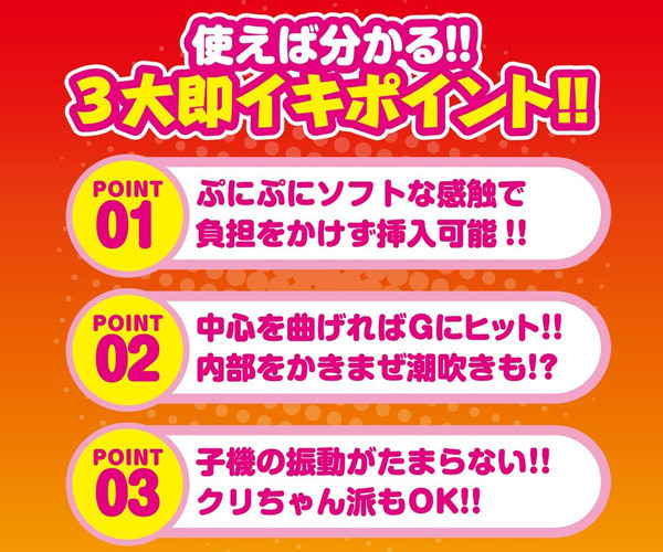 挿入部のサイズは約11.5cm、中心を曲げればGにヒット!内部をかき乱す回転で潮吹き体験も可能!さらに、クリトリス派にも嬉しい突起付きの強力振動クリバイブも装備しています。