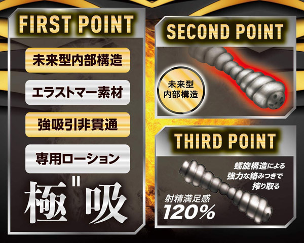 強吸引の刺激がマッハで射精を促す!螺旋構造によるヒダが生み出す極上の吸引で亀頭にしっかり絡みつき搾り取る。