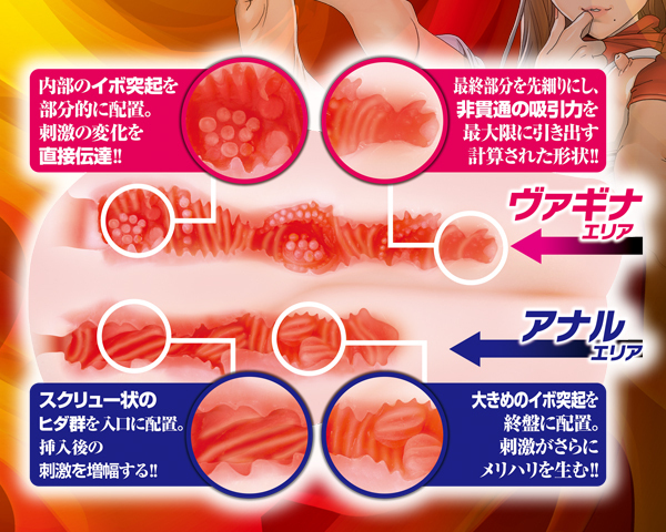 ダイレクトなイボ突起刺激と非貫通ならではの吸引力を最大限引き出した膣穴&螺旋状ヒダと大イボ突起のメリハリ刺激が気持ちいい尻穴の二穴仕様♪ほんのり色付くアソコも艶めかしいくびれも芸術的!視覚的にも使用感も大満足間違い無しの重量1800g肉厚オナホ。