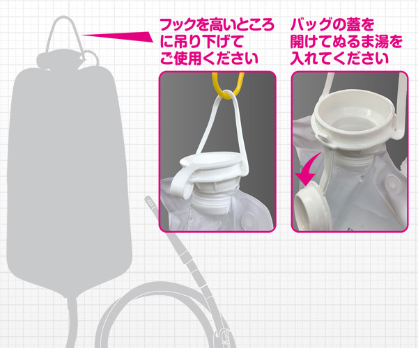 蓋を開けてぬるま湯を入れ、フックを高い所で吊り下げお使いください