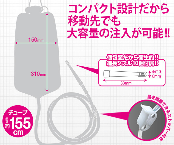高さ31cm、幅15cm、使用後は丸めて運べるコンパクト設計!個包装のゼリー付き細長ノズル10個が付いていて衛生的、さらに155cmのロングチューブまでセットとなっています。