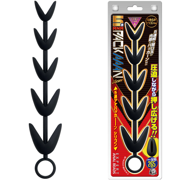 アナラー上級者はもとより普通のアナパッカーンとは違う刺激を求める方にも!シリコン製のビーズタイプだから入り口から挿れやすく、挿入するときはビースが1個1個閉じながら押し込んでいき、奥までくまなく簡単に圧迫♪括約筋に力を入れたり緩めたりすることで肉厚なビースの口がパクパクと動き、括約筋の内側で引っ掛かるのでクセになる快感が味わえます!挿入部は全長26.5cm、幅は1.9cm〜最大3.2cmまで対応!引き抜き時には内部に入れたビーズが連続して開口し、腸まで響きそうな5連の開口玉の刺激が他にはない圧迫感を与えてくれます♪「5連アナパッカーン」は通常のボールタイプよりも抜けにくく、普段のアナルビーズを使い慣れた方でもこの刺激は病みつきになること間違いなし!