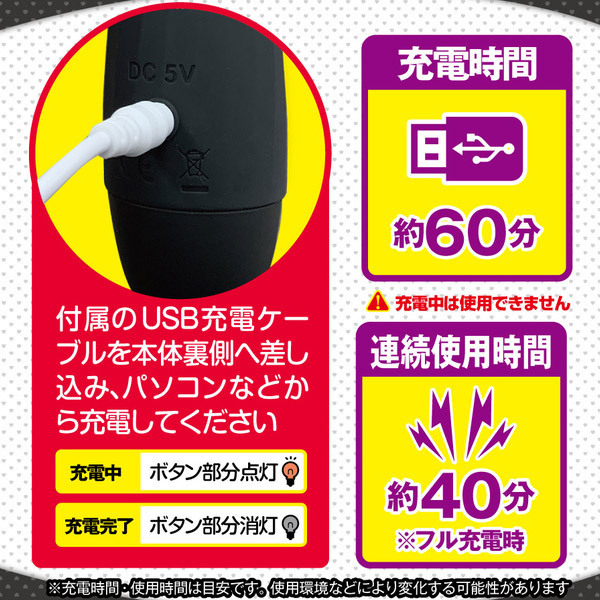 仕様:パッケージ:23.4×7.4×5.5cm 本体:全長17.5cm・ヘッド高さ4.0cm・ヘッド幅3.7cm セット内容:本体、充電ケーブル USB充電式