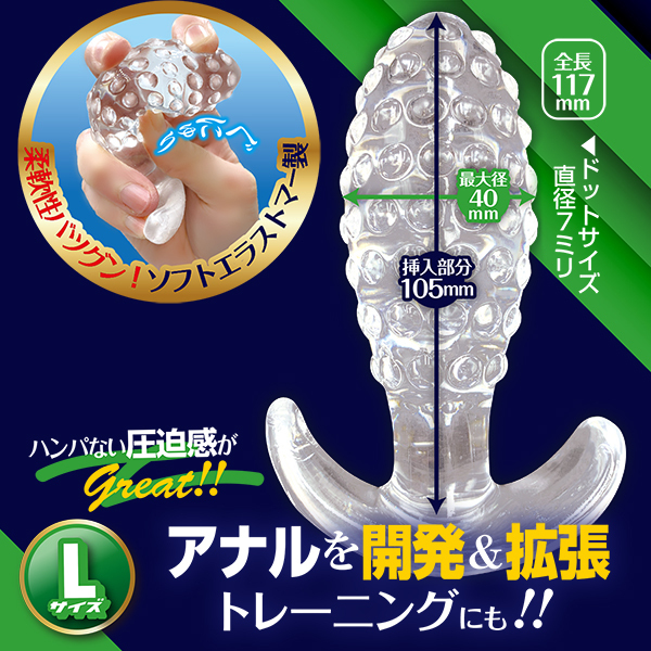 表面に配置された無数のドットイボによる圧迫感が心地良い「エネマソフトドッツL」です♪アナルの開発や拡張に最適なプラグで、開発レベルに合わせて3サイズから選ぶことができます。