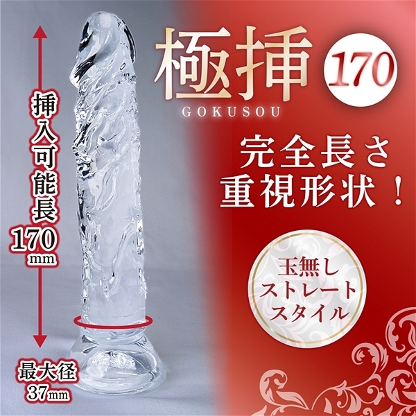 圧巻の挿入長170mmクリアディルド。程よい質感とスタイリッシュなクリア素材、タマ無しストレート形状で絶妙の太さなのに挿入可能長170mmを実現!吸盤で床や壁に固定して、セルフでもパートナーとも楽しめる高品質ディルドです。