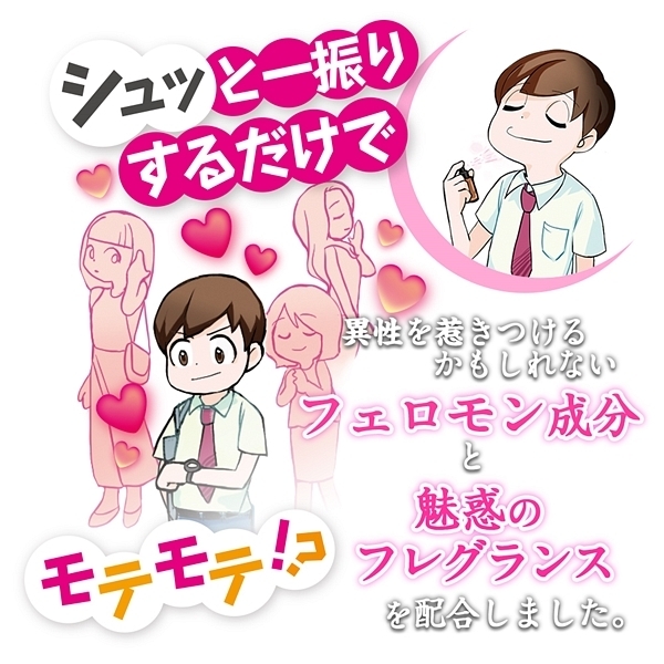 シュッと一吹きするだけで、異性に好かれるかもしれないエッチなフェロモンスプレーです♪異性を惹きつけるかもしれないフェロモン成分と魅惑のフレグランスを配合!これであっはんうっふん間違いなしかも♪本製品はジョークグッズです。