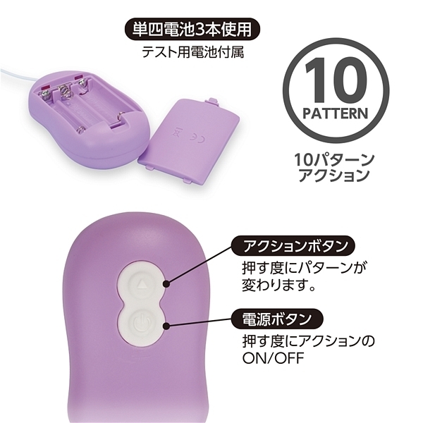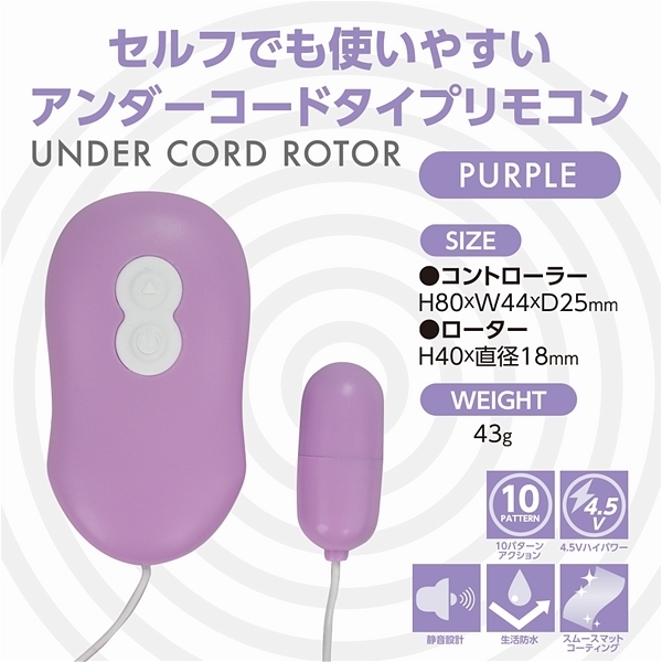 コントローラーの下側からコードが出ているためセルフプレイ時も通常時もコードの煩わしさが軽減されたスタイリッシュデザインのローターです♪握れば分かる使いやすさがウリで、他にはない使いやすさを重視したアンダーコードスタイルが特徴!単四電池3本を使用した4.5Vの強力振動マイクロモーターが搭載されていて、小径ローターで可愛いカラーバリエーション、さらにはマット加工を施すことで上質感を極めた新型ローターです♪10パターンの振動を備え、ハイパワーの4.5V仕様!生活防水仕様なのでローター本体の水洗いもできてローター部分はマット加工だから当て心地も良好♪10パターンアクションをワンプッシュで簡単にONOFF操作が可能です。