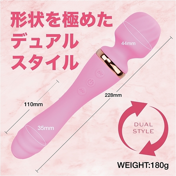 仕様:パッケージ:25.0×9.0×5.0cm 本体:全長22.8cm・電マ直径4.4cm・バイブ最大径3.5cm・挿入部全長11.0cm 重量:180g USB充電式