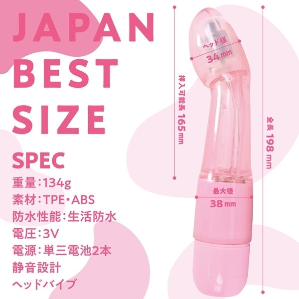 仕様:パッケージ:22.9×6.8×4.5cm 本体:全長19.8cm・挿入可能長16.5cm・ヘッド径3.4cm・最大径3.8cm 重量:134g 電池:単三電池×2本使用