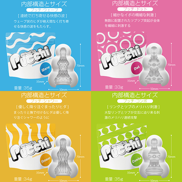 <ウェーブ内部構造>「連続で打ち寄せる快感の波」ウェーブ状のヒダが絶え間なく打ち寄せる快感の波をもたらす<ドット内部構造>「細かなイボの精細な刺激」無数に配置されたツブツブ突起が全体を繊細に刺激する<シャワー内部構造>「優しく降り注ぐまったりヒダ」まったりと撫で付けるヒダは優しく降り注ぐシャワーのように<コンボ内部構造>「リングとツブのメリハリ刺激」大型リングとツブが交互に迫り来る刺激のメリハリ連続攻撃